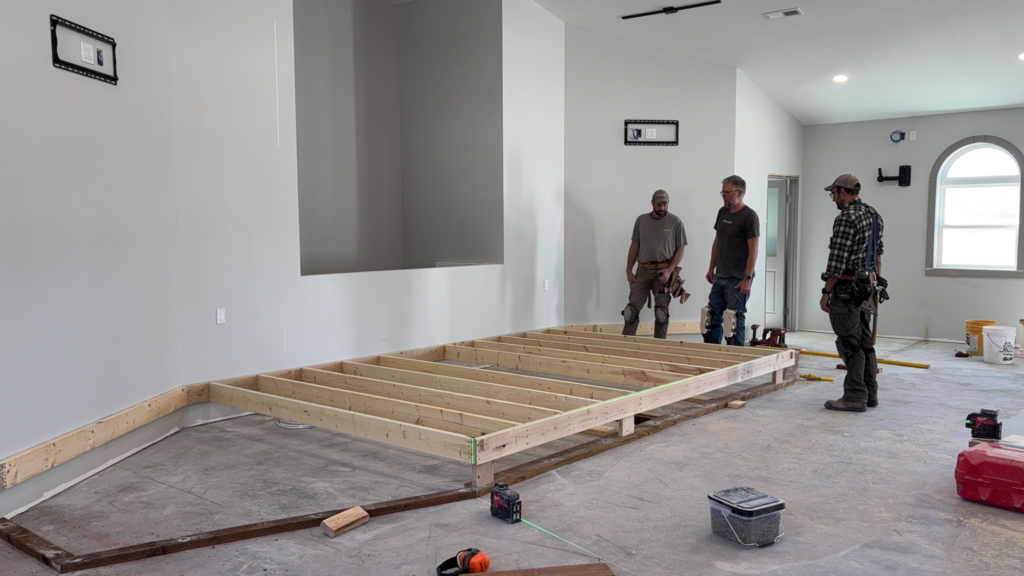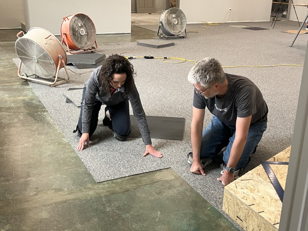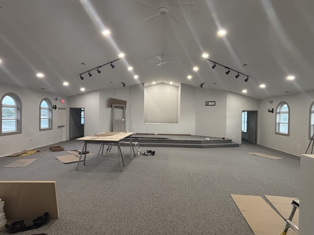 The building here is progressing rapidly. The builders have finished laying most of the carpet squares. The rest of the building will be vinyl planking. There is still a lot of trim work and painting to do along with installing the warming pantry cabinets. The finish line is in sight!